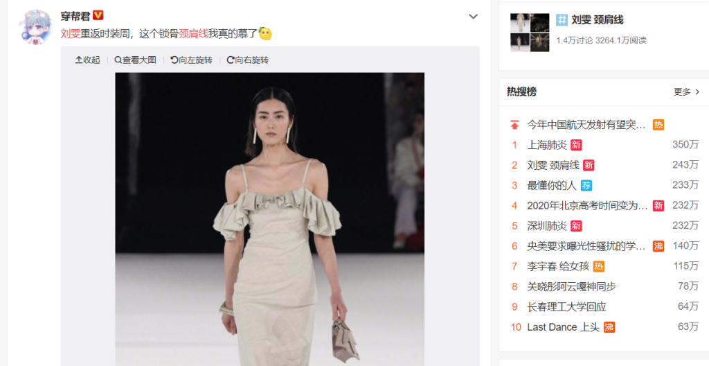 说到刘雯,其实大家都很熟悉,前段时间她还成为了vivo X30系列的代言人,在巴黎街头拍摄vivo X30系列广告片的时候也很迷人。但是作为一名专业模特,相比一些娱乐圈内的明星,她上微博热搜的次数其实并不多。身为超模,完美的身材以及高级脸就是刘雯最大的本钱。当然了,她之所以能够受到国内许多人的喜欢,与她开朗、大方的性格有关。最近,刘雯更是凭借着自己作为超模的“硬实力”——超迷人的颈肩线,上了微博热搜,这个热搜上得确实很有“专业水准”。