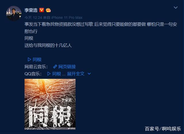 随后2月4日李荣浩也发布了自己的新歌《同根》。同样的这首歌也是为了疫情而作,这首歌致敬医护人员的同时,也写出了一些我们这些普通人的心声。