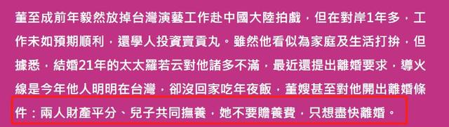 据悉,董至成夫妇结婚21年育有一子,平日里是圈内有名的恩爱夫妻,想不到两个人闹起离婚来,多年的恩爱成幻像,董至成平素疼爱妻子的形象也尽毁。