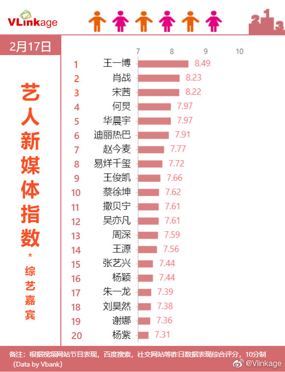 【寻艺指数】2月17日 艺人新媒体指数 (综艺嘉宾)Top 20榜单: