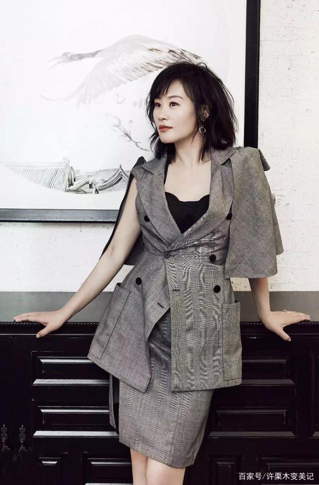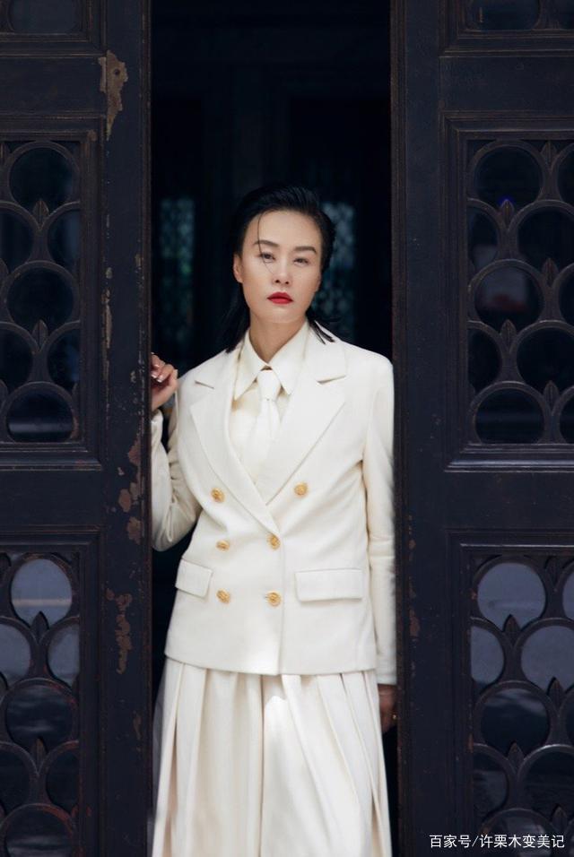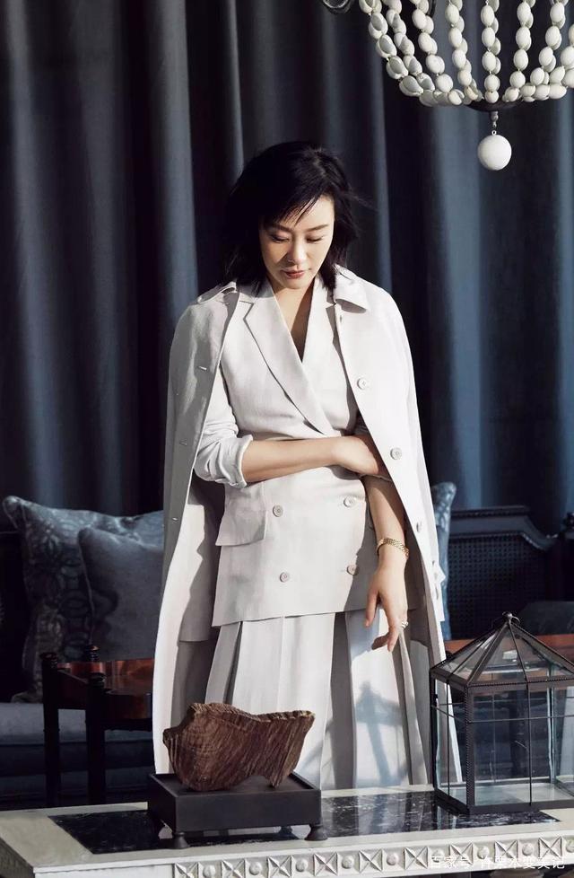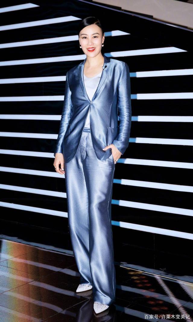 若是纯色西装入不了你的法眼,无法在人群中体现出你的独特性。那么,你就可以在西装面料的材质及花纹上下点功夫了,譬如左右不同颜色的阴阳西装、卡其色灰色的经典格纹西装都是不错的选择,但在此小编确认为缎面材质的西装或许在吸引她人眼球上更胜一筹,气质美女邬君梅应该也这么觉得,图中的她身着蓝色缎面西装,其让人悦目的光泽感着实高级。合身的西装款式、及地的阔腿西装裤,内搭比西装浅多个色度的大领口缎面衫,简直是都市白领圈的时尚女魔头。