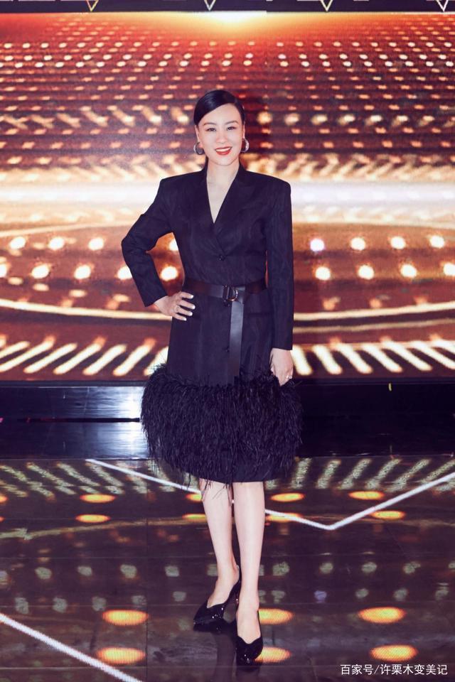 难以搭配出创新性的黑色西装来了,但邬君梅的这身黑色西装搭配却单调。款式是较为简单但剪裁立体的V领小西装,肩部置入了垫肩,让本就硬挺的西装版型显得更为立体,下身搭配呈A字形的半身裙,杂乱的恰到好处的裙摆羽毛,可谓是其中的点亮,而其中的小心机就是腰间的宽腰带,让你瞬间拥有A4腰、大长腿。在款式简单但具备独特性的西装款式中,建议可以搭配欧美简约风夸张耳饰,能够在视觉上让你的脸看起来变瘦,还会给你的穿搭加分不少。