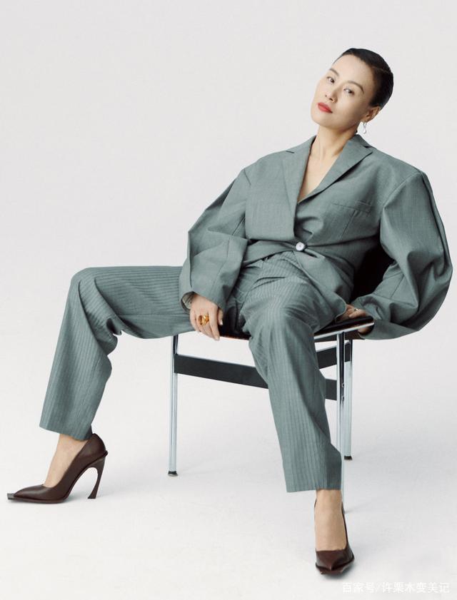 选对一款西装的前提,就是要选择好版型的西装。好版型的西装,上身后可以遮盖住多余赘肉、提升你整个人的气质,而版型中添加些许小心机的话,就可令你轻松拥有个性感。邬君梅霸气的坐姿中所穿达出的独特个性感,至少有一半的功劳得归功于这身西装,西装是时下热门的oversize款式,落肩加上大袖口的设计,让人感受到丝丝街头时尚感,西装裤选用了带有米白色条纹的配色面料,让整套搭配不会显得那么死板。上身宽松,下身较为收紧的搭配,有显瘦增高的完美效果。