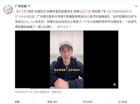 2月24日王力宏在微博给粉丝黄静发了一个定制祝福视频,内容是自己演唱她最喜欢的《心跳》,配文:“给黄静一些祝福,也不知道她能不能看到,也希望她的朋友看到能帮忙转发给她。”黄静是谁?粉丝初看是嫉妒,细看是感动:南医三院EICU护士黄静在生日当天出征湖北支援,男同事模仿她粉了十多年的王力宏[微博]为她唱歌送别,王力宏看到这则视频后被触动,因此录制了视频。