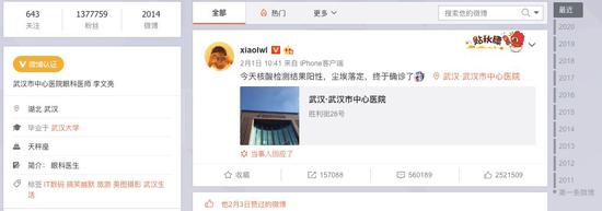 2020年2月7日,曾经率先发出预警的“为众人抱薪者”李文亮医生不幸逝世,全国网友沉痛悼念,在微博上去“追寻”这位英雄过去日常生活的点滴,成为很多网友的悼念方式。名为“xiaolwl”认证为“武汉市中心医院眼科医师 李文亮”的微博粉丝很快飙升到138万,从微博来看他是一个数码迷,曾经是果粉一枚,他的最后一条微博是:“今天核酸检测结果阳性,尘埃落定,终于确诊了”,评论高达56万,点赞最多的一条是“加油,祝您早日康复”。