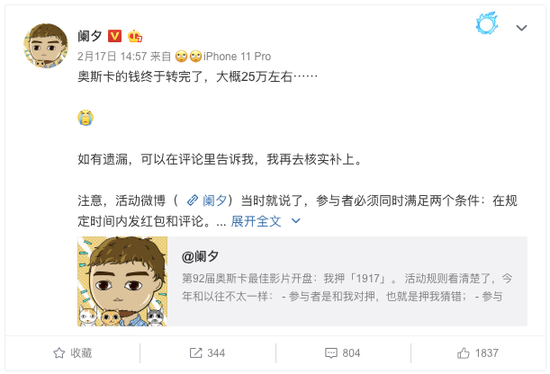 2月26日,知名科技自媒体“阑夕[微博]”在微博发布了文章[微博]《武汉封城日记| 第三十五天》,到这一天,武汉封城已经35天了。阑夕家在武汉,自从武汉封城以来,每天在微博发布一篇“封城日记”,记录自己在这次疫情中的一些思考。另一方面阑夕的生活在继续,继续关注科技话题的同时,阑夕停止更新了老司机话题,他在微博的保留节目奥斯卡“赌局”却未终止,《寄生虫》成为本届奥斯卡超级黑马,阑夕果然再一次输得很惨,大概25万金额发给了广大网友,被戏称为武汉人民“反向捐款”。