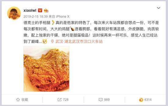 在汉口火车站吃了德克士后他说:“德克士的手枪腿真的是他家的特色了,每次来火车站我都会想点一份,可不是每次都有时间,大大的鸡腿连着胯部,看着就好有满足感,外皮酥脆,肉质软嫩,配上独家的干碟,绝对是腿届极品!这时候再来一杯可乐,感觉人生已经达到了巅峰…”