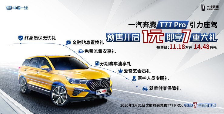 另外,奔腾T77 PRO现已开启预售,预售价11.18万-14.48万,并且在3月31日前购买奔腾T77 PRO,还能专享7重超级礼遇。如此大礼,更是不容错过。