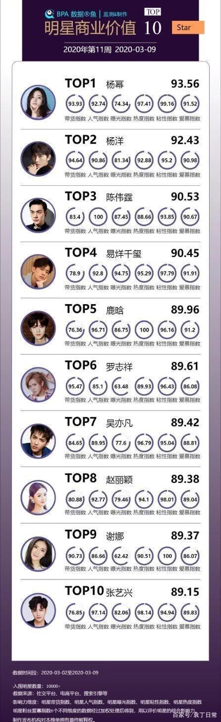 近日,受疫情的影响,许多明星艺人都纷纷宅在家中,以身作则,为社会减压,但是他们依然拥有超高的影响力。近日,有媒体也曝光了2020年第11周(3月2日至3月9日)明星商业价值排行榜。