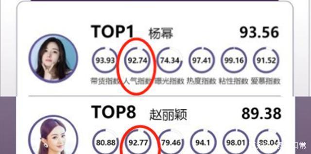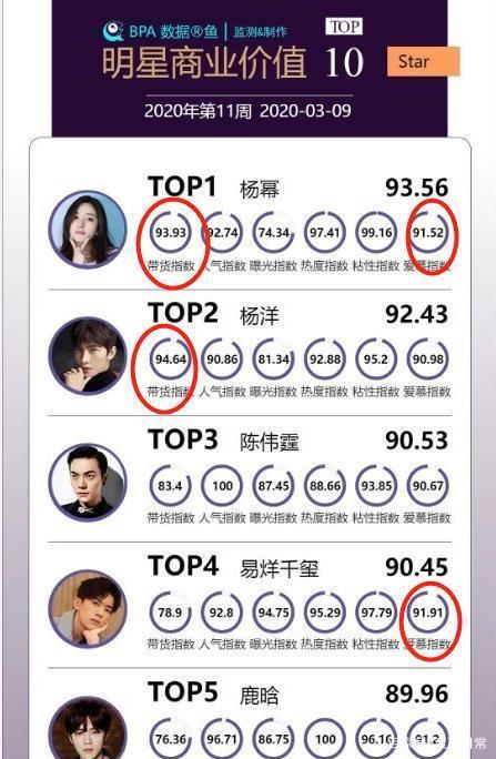 在这份榜单中,杨幂以综合分93.56的成绩稳居榜首,不过她的带货指数逊色于第二名的杨洋,爱慕指数稍稍低于易烊千玺,曝光指数在前十名中也只是高于谢娜和罗志祥,不过总体的指数分均衡。