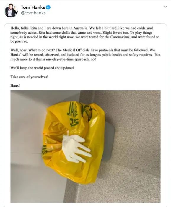 此次汤姆·汉克斯夫妇受感染后没有做任何的隐瞒,也没有顾及所谓的名声、商业影响等等,反而是第一时间自己发声,告知世界并倡议做好防护。我认为此举是有勇气、有担当、有责任感的体现,不愧是一名好演员!祝美国阿甘汤姆·汉克斯早日康复。