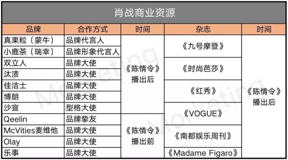 此外,据Morketing不完全统计,在《陈情令》播出后,肖战签约了小鹿茶、蒙牛真果粒、双立人、汰渍、佳洁士、沙宣、博朗7家品牌,拍摄了《九号摩登》、《南都娱乐周刊》、《VOGUE》、《时尚芭莎》、《红秀》、《Madame Figaro》6家时尚杂志。