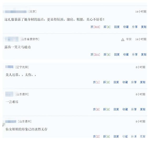 包括被媒体各种恭维的造型,有网友却说:这礼服暴露了她身材的弱点:更显得短颈、溜肩、粗腰,真心不好看!有人更直接:露齿一笑立马破功!总之就这次刘亦菲现场照真的仙气全无,87年出生的刘亦菲也才33岁而已,按理也不该就此仙气尽失!