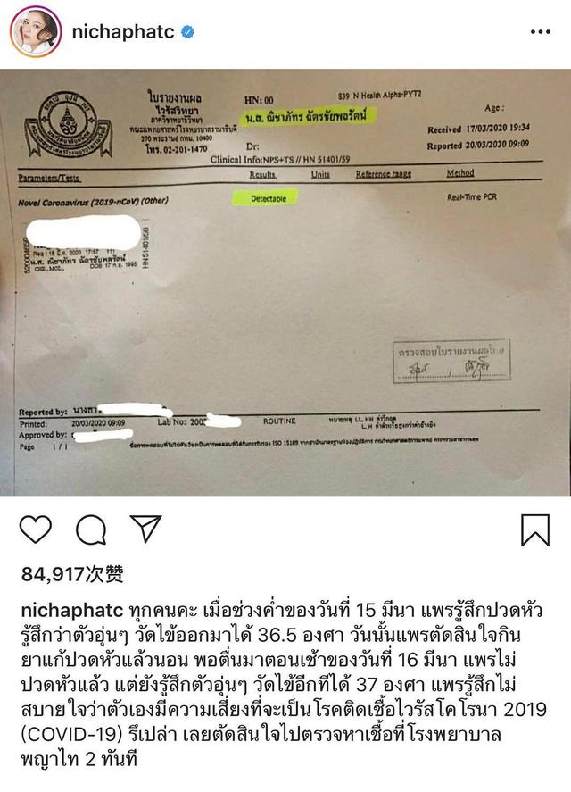 近日,泰国新晋歌星Pearwah被确诊为新冠肺炎。Pearwah通过社交媒体透露了相关细节,她是15日晚间感觉到身体一样,16日仍不见好转,17日在接受检查时被确诊,目前正在接受医院治疗。