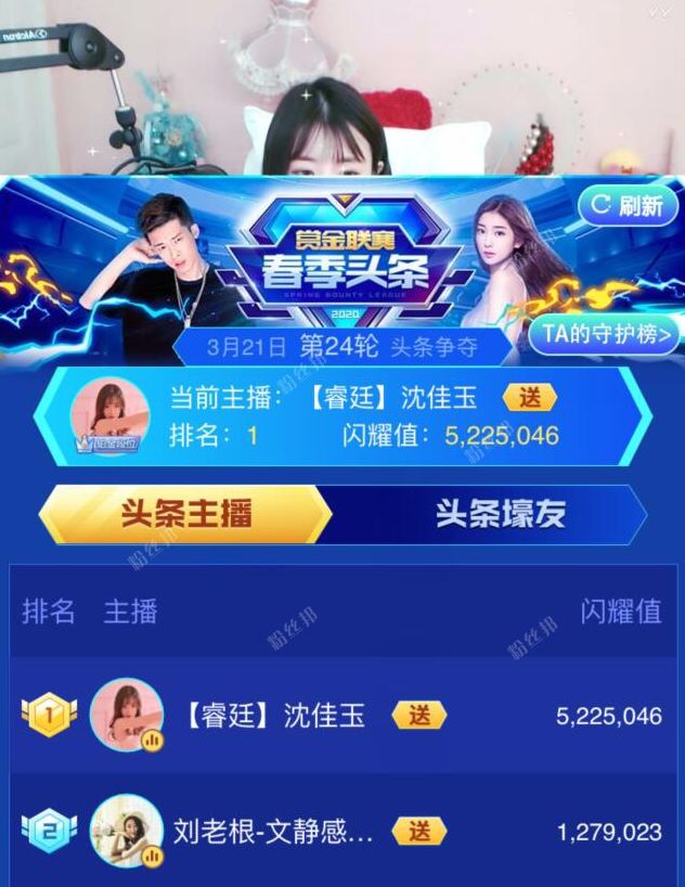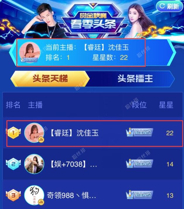 目前截止粉丝邦小编发稿,沈佳玉是2020年YY春季头条“天梯榜”第一名,而3月21日晚第24轮的头条沈佳玉也毫无悬念会拿下。
