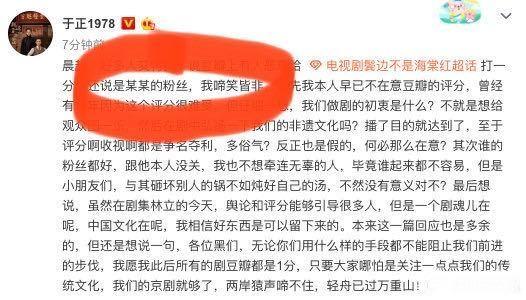 从于正的微博动态来看,他虽然明面上的确称宣扬文化传统就行,但是从字里行间还是表达出了对恶意打低分的不满,当他得知打低分的是某某粉丝的时候,直接表示无语,文章似然没有提到明星真名,但是他在内涵谁,早就有目共睹。
