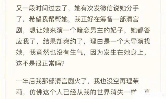 并且他还称当时有一个清宫剧里的一个重要角色要给“茉莉”演,但是本来都答应好的,最后她却出演了一个大导演的片子,直接爽约。当时网友猜测于正应该是想让张檬演《延禧攻略》里的纯妃,最后《延禧攻略》这部剧火了,于正也就没有再搭理张檬了。