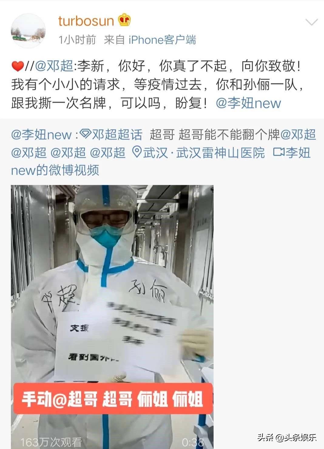 近日,有驰援武汉的抗疫一线医护粉丝发布视频表白邓超孙俪夫妇,26日,邓超暖心回复道,“李新,你好,你真了不起,向你致敬!”他还邀请这位医护粉丝在疫情结束后,和孙俪一队跟他撕一次名牌。随后,孙俪也转发并配上爱心表情。