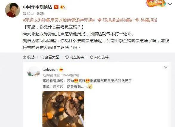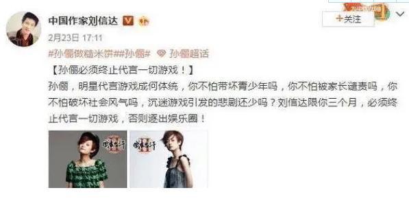 微博上有个名为"中国作家刘信达"的博主,公开喊话孙俪,要求她戒烟,还让她终止一切与游戏有关的代言,说这些容易带坏青少年,如果她不这样做就要将她逐出娱乐圈。但其实这位所谓的作家真实身份并不是什么作家,他是出了名的会蹭热度。