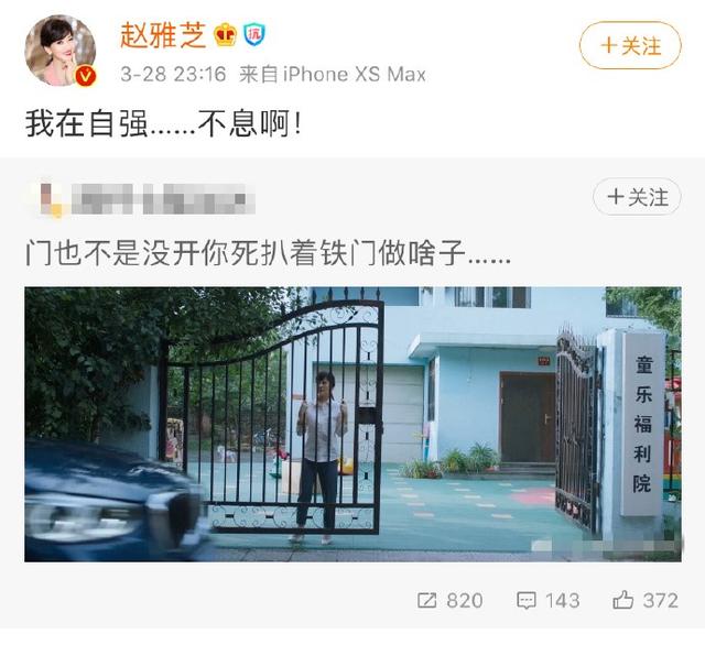 调侃她:“门也不是没开,你死扒着铁门做啥子……”,哈哈哈哈赵雅芝看到后居然转发并回复说:“我在自强……不息啊!”↓