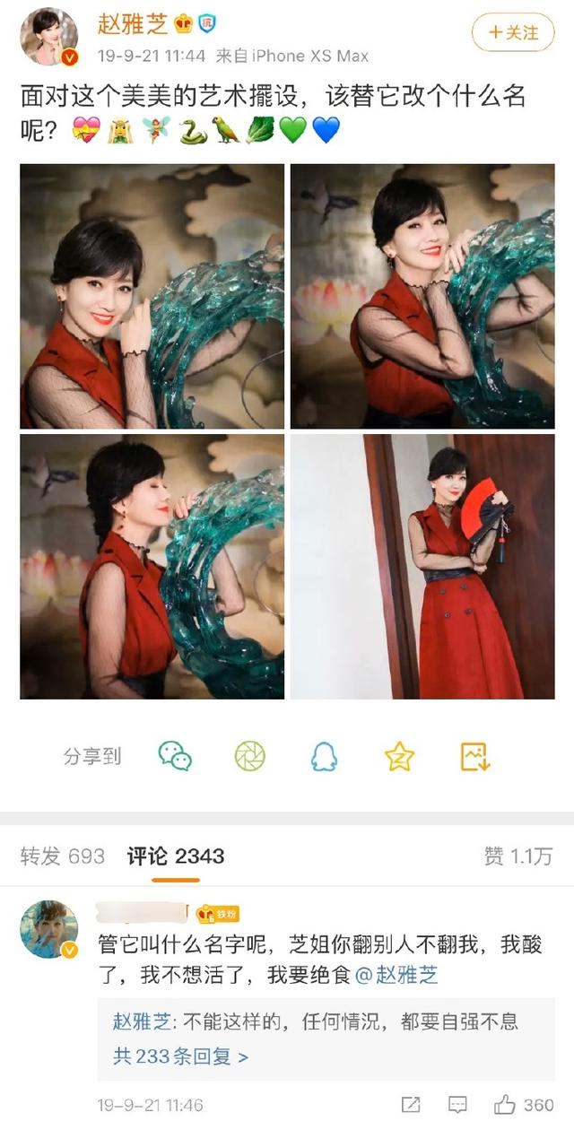 有次一个网友想得到赵雅芝的回复,所以故意说:“芝姐你翻别人不翻我,我酸了,我不活了,我要绝食!”,赵雅芝看到后很认真地回复说:“不能这样的,任何情况,都要自强不息!”↓