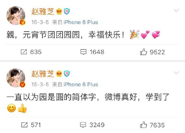 还有次元宵节,她把团圆的“圆”字打成了“园”,经过网友纠正后她解释说自己一直以为“园”是“圆”的的简体字,还感叹网友真好,自己又学到了一个知识。