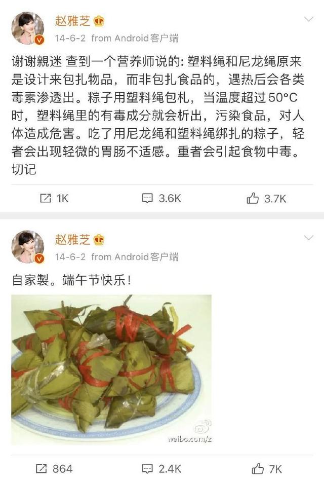 到了端午节,赵雅芝晒出了自己包的粽子,大家发现她居然拿塑料绳绑粽子,于是她又赶紧出来给大家科普,说自己查了营养师的话才知道塑料绳不应该拿来包扎食品,还提醒网友们一定要小心。