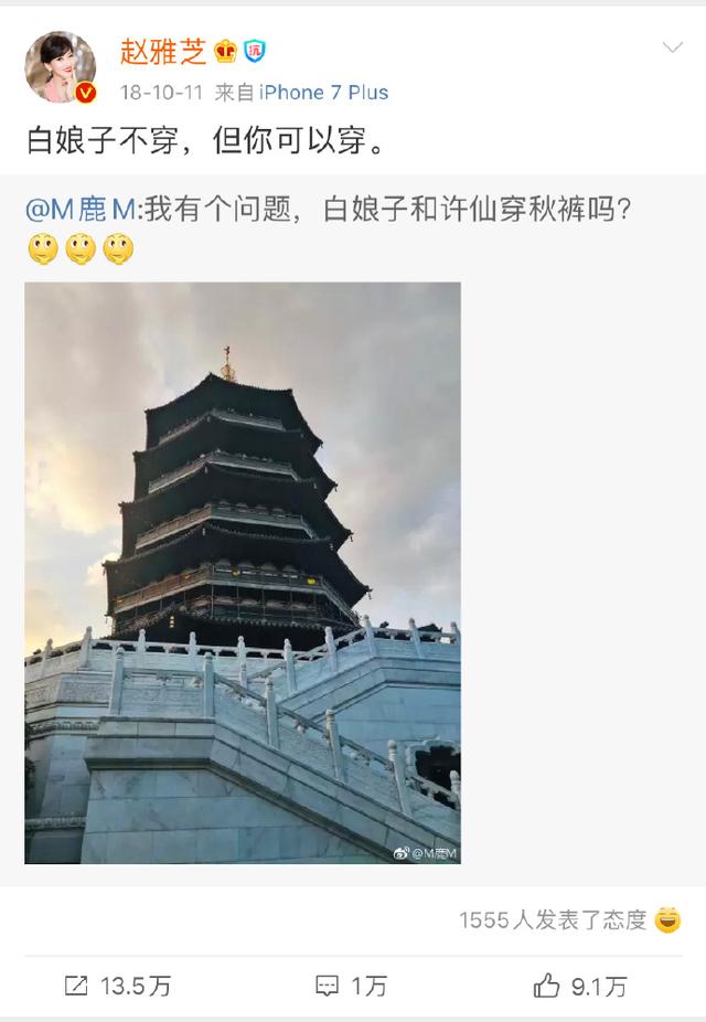 有次粉丝们又催他穿秋裤,鹿晗就问:“白娘子和许仙穿秋裤吗?”,没想过赵雅芝看见了这条微博,立刻转发说:“白娘子不穿,但你可以穿”↓