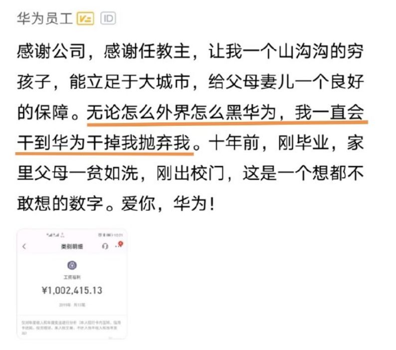 2019年春节,任正非发表总裁邮件称,“华为员工平均年薪达110万元”。