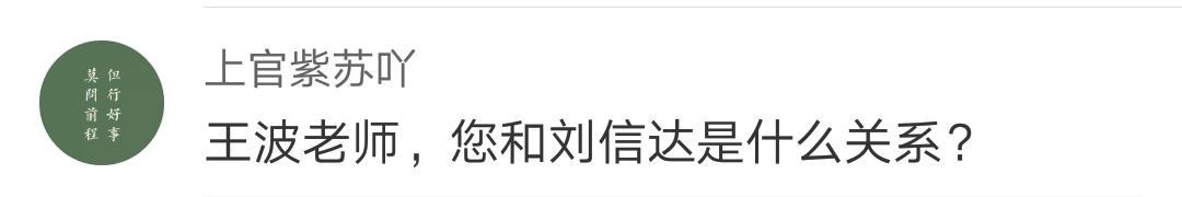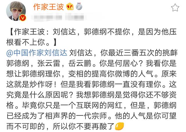 王波义正言辞地说到:“刘信达,郭德纲不提你,是因为他压根看不上你。刘信达,你最近三番五次的挑衅郭德纲,张云雷,岳云鹏。你是何居心?我看你是想让郭德纲理你,变相的提高你微博的人气。原来这就是炒作呀!”
