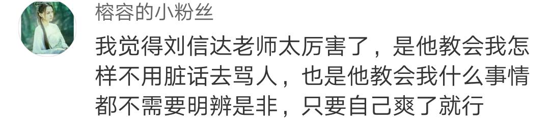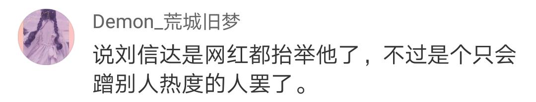 对此,网友们纷纷留下了各自的看法:“说刘信达是网红都抬举他了,不过是个只会蹭别人热度的人罢了。”、“我看你是个碰瓷儿了,热度不如刘信达,还好意思指指点点”、“我觉得刘信达老师太厉害了,是他教会我怎样不用脏话去骂人,也是他教会我什么事情都不需要明辨是非,只要自己爽了就行”、“刘信达真是看人家看的太眼红了,嫉妒心爆棚,不蹭人家的热度那根本就没法让他自己平静下来”、“他不是人品有问题,他是整个人有问题,一人渣何必跟他计较,都不带把他放眼里,当狗屁放了便是!”、“支持你呀,说得好”、“王波老师,您和刘信达是什么关系?”