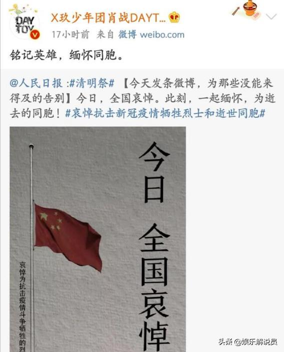 许多娱乐圈明星在这一天也纷纷发文表示哀悼,肖战也转发人民日报微博并且写上“铭记英雄,缅怀同胞”向抗击疫情的英雄传达出来的强烈敬意