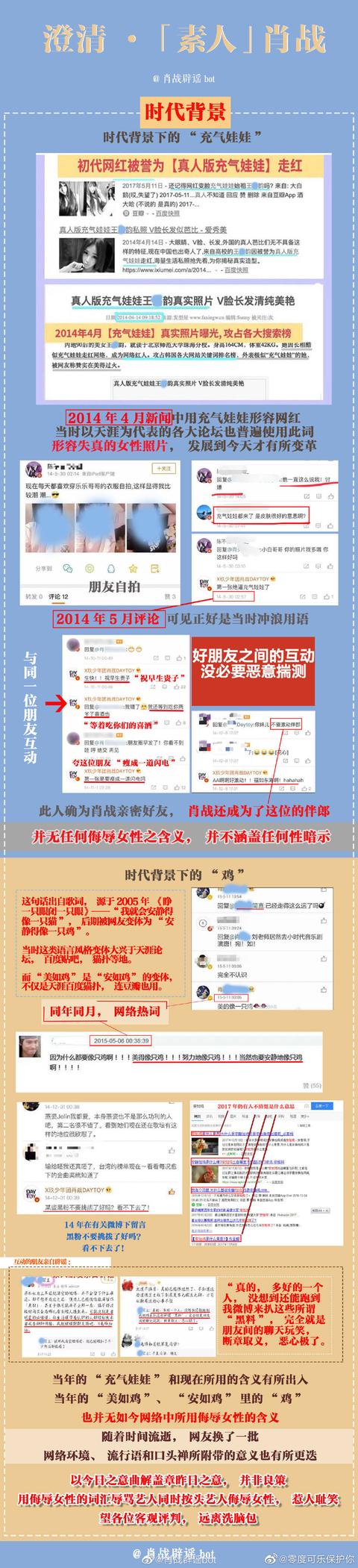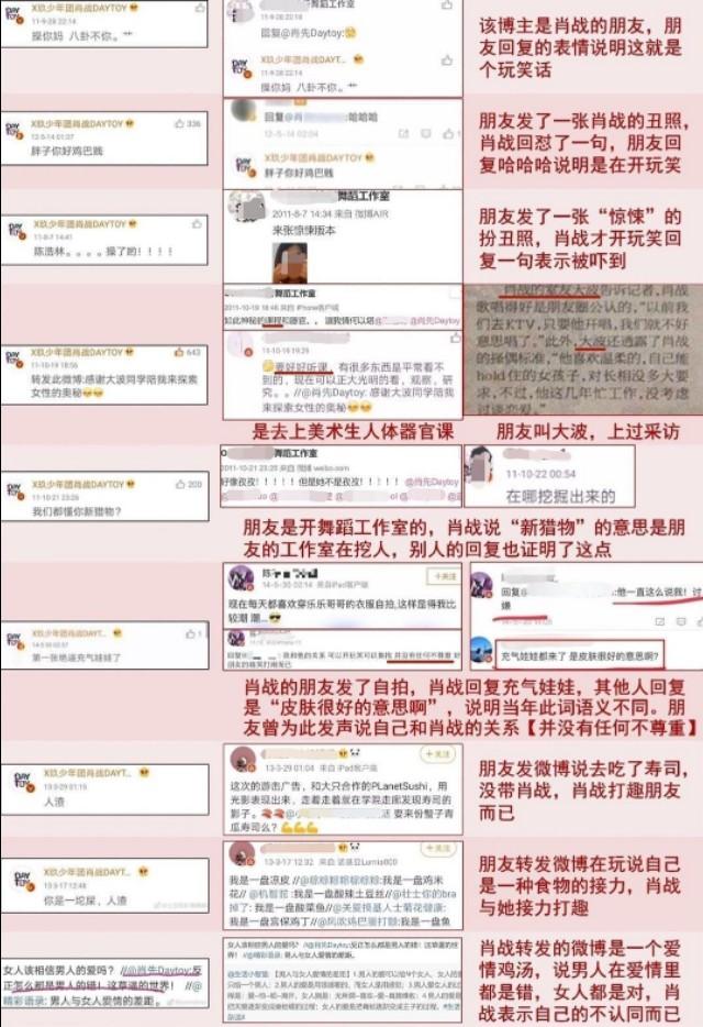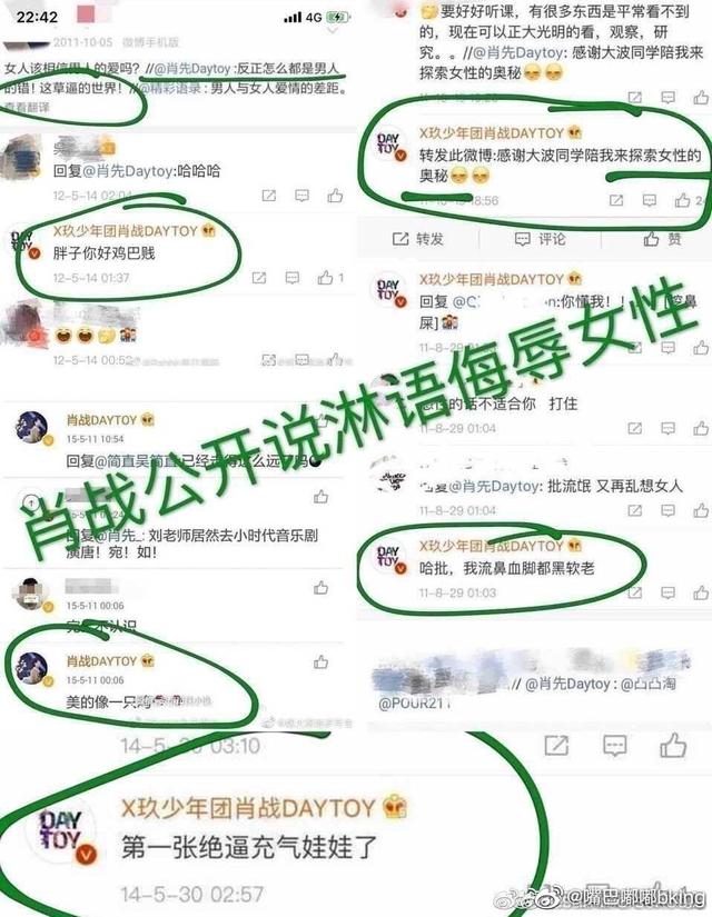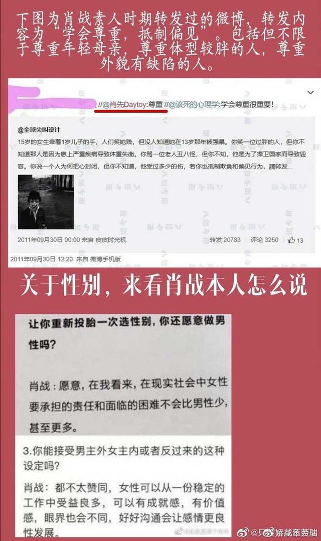 稍微关注他的人都应该知道227事件,一直吵的比较凶,我在这里就不对此事做过多介绍了,大家心里都有数。(我不混圈,却也能想象到同人作者们的心情,这件事确实是被某些个别nc粉丝给搞大了,同人圈子是一个文化,举报网站的行为真是不明智。)而我今天想说的是,接下来发生的一系列的事情。这件事本身就跟肖战关系不大,谁做的谁承担责任,本以为事情到这便可以得到应有的解决了,不成想这才只是个开始。紧接着,便有各种各样的人出来爆猛料。翻出肖战以前的微博评论,发出各种“铁证”,说他侮辱女性,种族歧视,说脏话,表里不一,谎话连篇,支持粉丝网暴别人,肖战被检察日报人民日报公开点名批评等等。先上一张黑子们扒出来的“证据”。