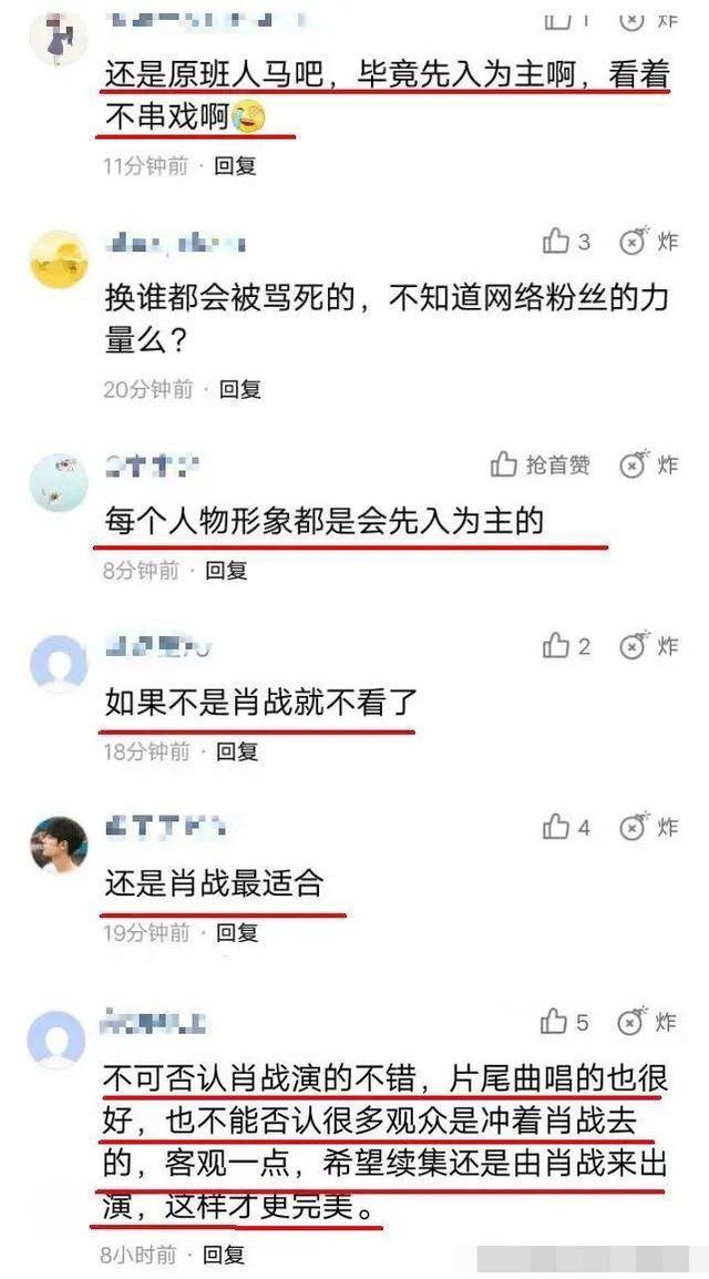 当然了,更多的人是不带情绪的客观立场,认为已经先入为主了,还是争取原班人马吧。还有人表示觉得肖战最合适,认为肖战演得不错,片尾曲唱的也很好,更是有许多观众是冲着肖战去的,客观一点的说,大家都希望原班人马演出,希望肖战能来出演,这样才完美。