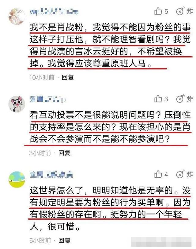 觉得不能因为粉丝的事这样打压他,觉得言冰云演的挺好的,不希望被换掉,尊重原班人马,我们看剧应该理智,更不能随便就抹灭人家的努力。