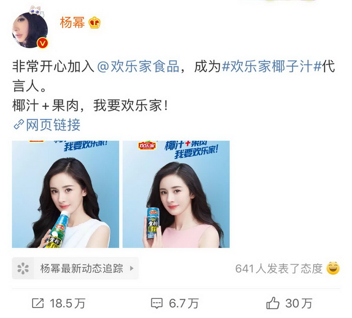 中新网4月26日电 25日上午,杨幂更新个人微博,正式对外公布担任欢乐家椰子汁代言人,并喊出“椰汁+果肉,我要欢乐家”的品牌宣言,迅速成为热门话题。