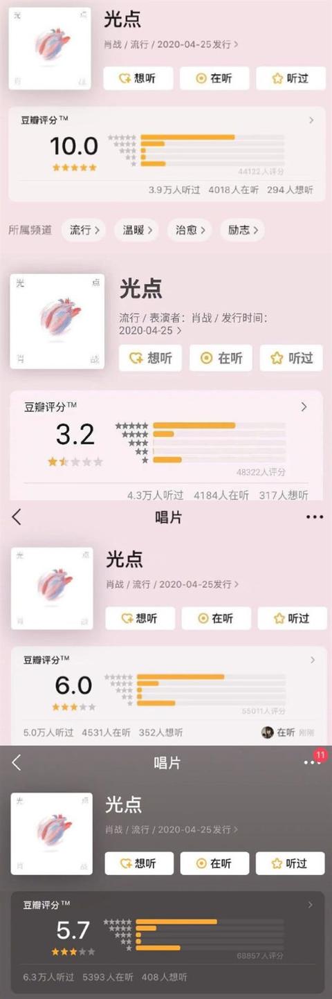 虽然肖战歌受到粉丝们追捧,但也惹来不少话题,肖战新歌在发布初期,在豆瓣上评分一度是10分满分,但到了半夜直接跌落到3.2分,之后又变成6分、5.7分,到目前稳定在5.6分。