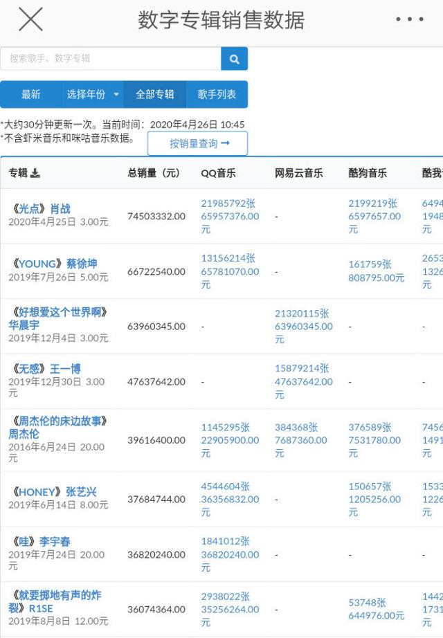 据最新统计显示,肖战的新歌在各大音乐平台总销量已突破了7450万。事实上,这首歌发布不到11小时,在 在QQ音乐、酷狗、酷我音乐三大平台上累计销量就突破1375万张,销售额超4000万元。这样的成绩甚至超过了2019年周杰伦新歌《说好不哭》11小时的销量(600万张)。