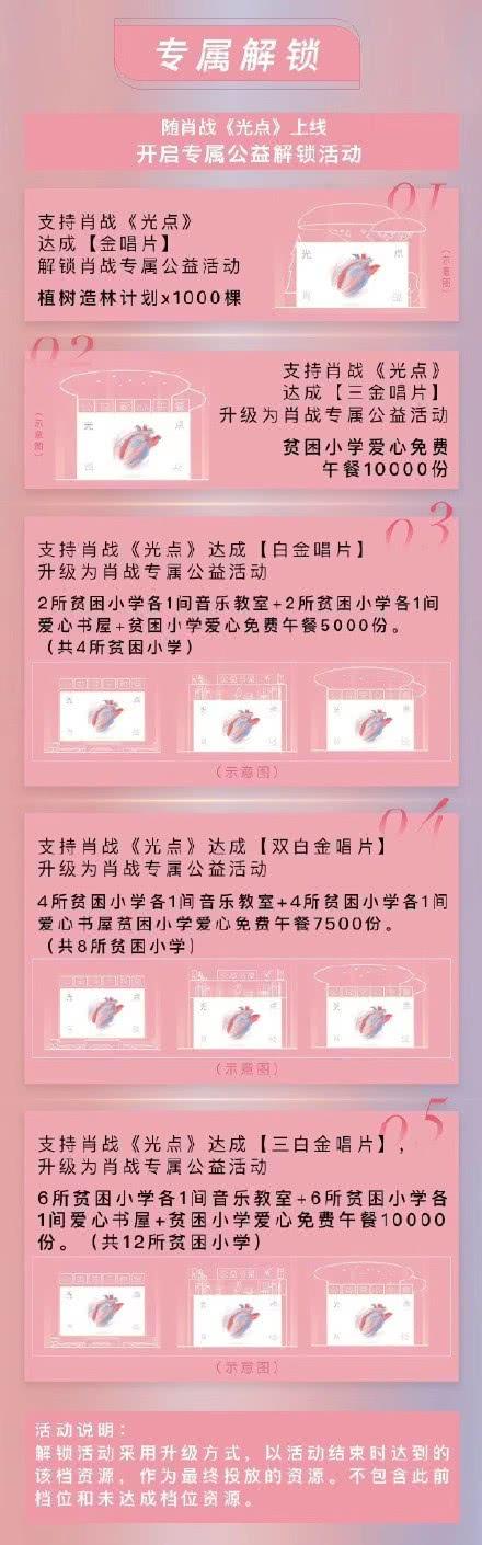 值得一提,肖战这首歌的公益主题也很值得称赞,当新歌达到某个目标就会解锁相应的公益活动。目前已成功解锁6所贫困小学各1间音乐教室+8所贫困小学1间爱心书屋+贫困小学爱心免费午餐1万份+公益快乐美术教室。