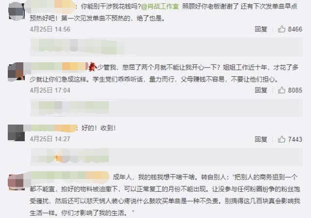 面对肖战工作室这种呼吁,有粉丝们居然怼上了工作室:“少管我,憋屈了两个月就不能让我开心一下?姐姐工作近十年,才花了多少就让你们急成这样。学生党们乖乖听话,量力而行,父母赚钱不容易,不要让他们担心。”“成年人,我的钱我想干啥干啥。”“你能别干涉我花钱吗?”