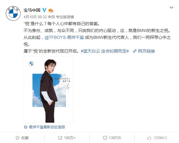 4月10日,@宝马中国 宣布易烊千玺成为BMW新生代代言人。此前,宝马中国发布话题#蓝天白云,定会如期而至#,并给2020年写了封信,由易烊千玺读朗读公开发布。