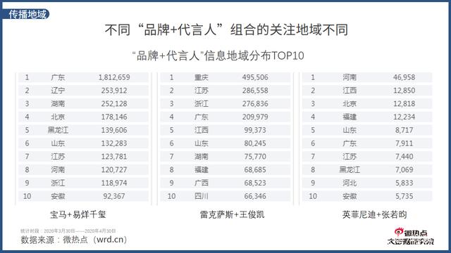 从关注地域来看,广东、辽宁、湖南等地的网友对“宝马+易烊千玺”的关注度较高,而对于“雷克萨斯+王俊凯”而言,重庆、江苏、浙江等地关注度较高,而“英菲尼迪+张若昀”的关注度主要集中在河南、江西、北京等地。据公开资料显示,易烊千玺、王俊凯、张若昀的故乡分别为湖南、重庆、北京,而这些地域的“代言人+品牌”关注度均在关注地域TOP4之内,代言人对品牌在其家乡的传播或将起到助推作用。