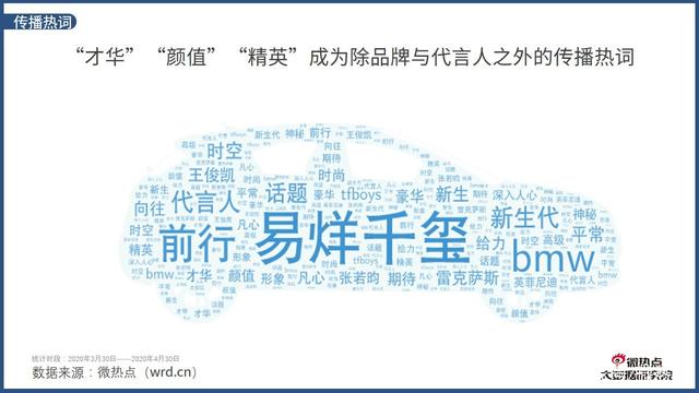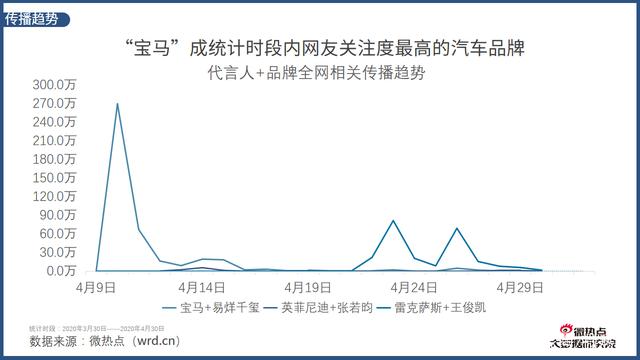据微热点(wrd.cn)数据统计显示,在4月9日——4月30日期间,品牌+代言人的声量在品牌官宣代言人之后迅速上升,“宝马+易烊千玺”的相关信息量达426.3万,成为统计时段内网友关注度最高的汽车品牌,且在传播过程中形成多个峰值。