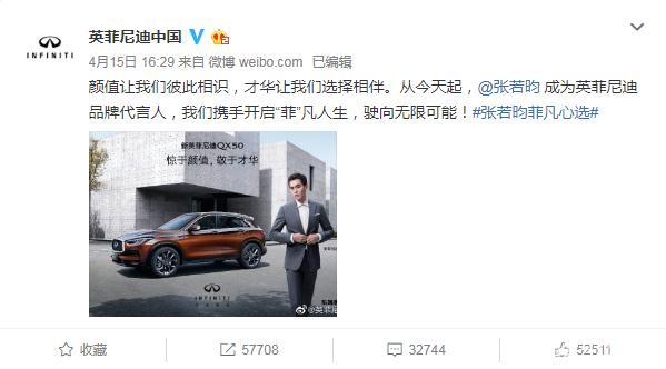 4月15日,@英菲尼迪中国 宣布张若昀成为英菲尼迪品牌代言人,携手开启“菲”凡人生,驶向无限可能。并于 4月28日推出由张若昀出演的年度大戏《菲同寻常的贺礼》。