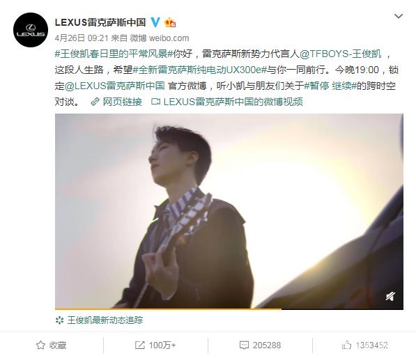 4月26日,@雷克萨斯 官宣:“雷克萨斯新势力代言人@TFBOYS-王俊凯,这段人生路,希望全新雷克萨斯纯电动UX 300e与你一同前行。”