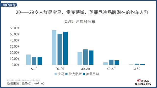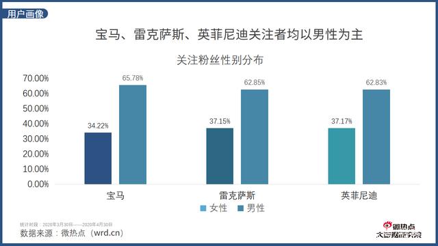 宝马、雷克萨斯、英菲尼迪品牌的关注用户均以男性用户为主,选择易烊千玺、王俊凯、张若昀这些以女性粉丝居多的代言人,不仅在形象上与品牌契合,且更有助于品牌与代言人粉丝之间建立起联系,加深粘合度。
