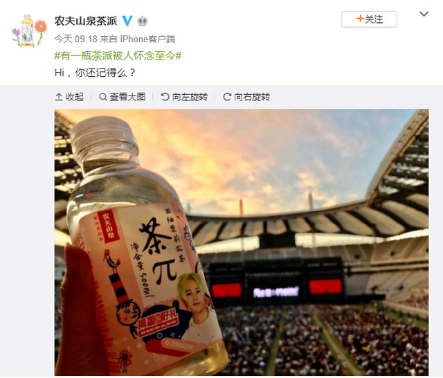 2020年4月7日,农夫山泉茶派官博发布了一则微博,公开的照片是当年BigBang代言的茶派产品权志龙的单人版本!更有粉丝发现近日权志龙ins公开的图片中有看似手拿着茶派产品的拍摄现场图。