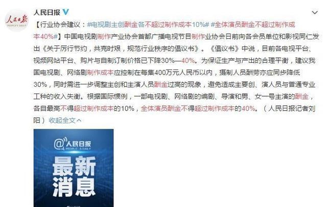 为了提高影视剧品质,中国电视剧制作产业协会发布《倡议书》,书中规定,一部电视剧、网络剧的编剧、导演和男、女一号主演的酬金,各自最高不得超过制作成本的10%,全体演员酬金不得超过制作成本的40%。这就是广为流传的 “限薪令”。