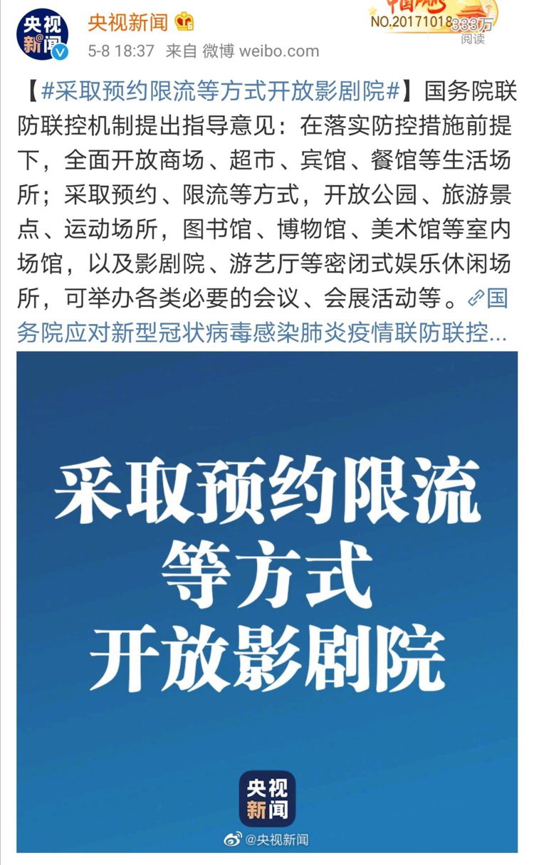 电影院要开门了!在国内几乎所有电影院关闭了三个多月之后,我们等来了电影院可限流开放的消息。据中国政府网5月8日消息,国务院印发应对新型冠状病毒感染肺炎疫情联防联控机制关于做好新冠肺炎疫情常态化防控工作的指导意见。