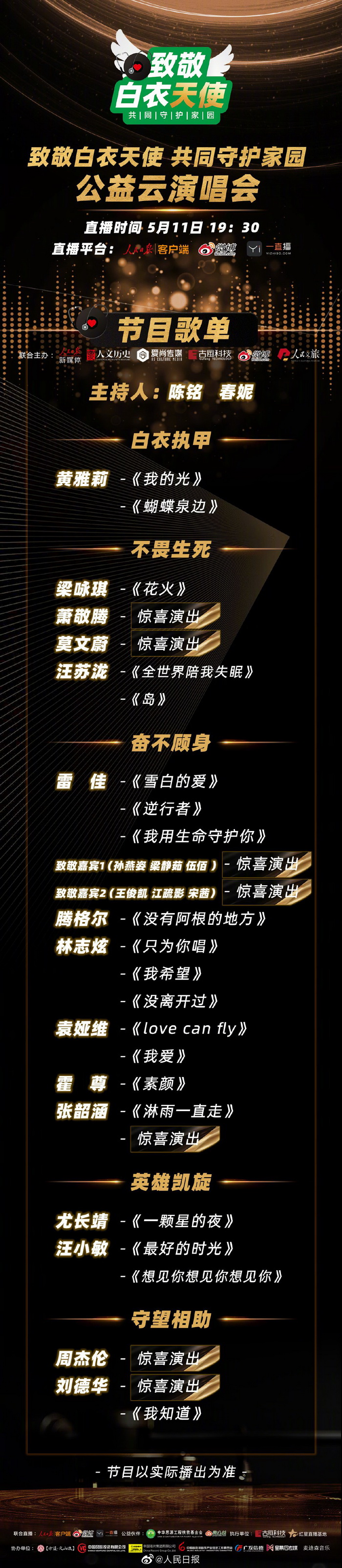 刘德华、周杰伦、张韶涵、萧敬腾、袁娅维、霍尊、雷佳、梁咏琪、林志炫、莫文蔚、腾格尔、汪苏泷、汪小敏、尤长靖、黄雅莉